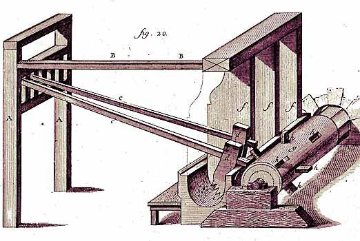 à cames, entraîné par une roue hydraulique, fait retomber alternativement sur